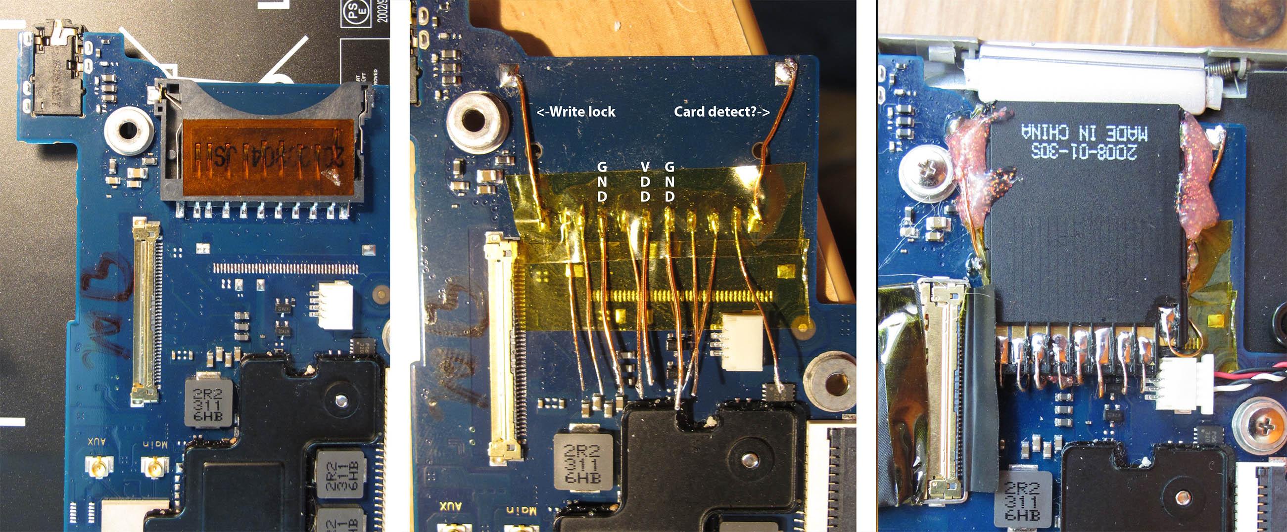 Now, let’s proceed with the card slot (left third of the picture). Unsolder the card slot, starting at the edge of the board with the large pads. A good soldering iron and a thin piece of steel to lift the pins individually from the pads is handy. Hot air also works if you preheat the PCB before, but I switched to my soldering iron because the PCB drew away the heat from the air gun too quickly.